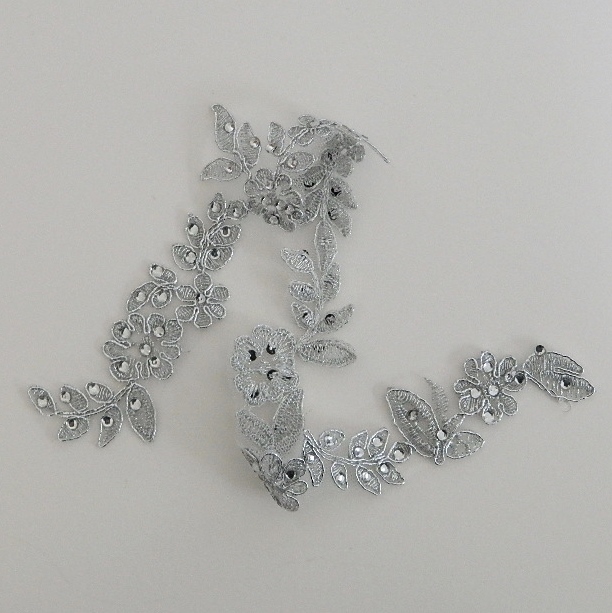 Narrow floral applique Pair in metallic silver thread with silver cording and sequins.